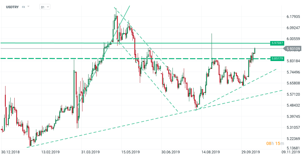 Lira turcească, pe de altă parte, continuă să sufere deprecieri. Ofensiva în nordul Siriei va continua, independent de opiniile altora, insistă Erdogan, potrivit unor comentarii foarte recente. SUA a pregătit sancțiuni, iar Secretarul Trezoreriei a afirmat că e acum mingea în terenul președintelui pentru implementare. USDTRY pare că așteaptă întocmai un astfel de anunț pentru a pune presiune pe rezistența de la 5.97, înaintea nivelului rotund de 6. Suportul se află la 5.85 și 5.70.