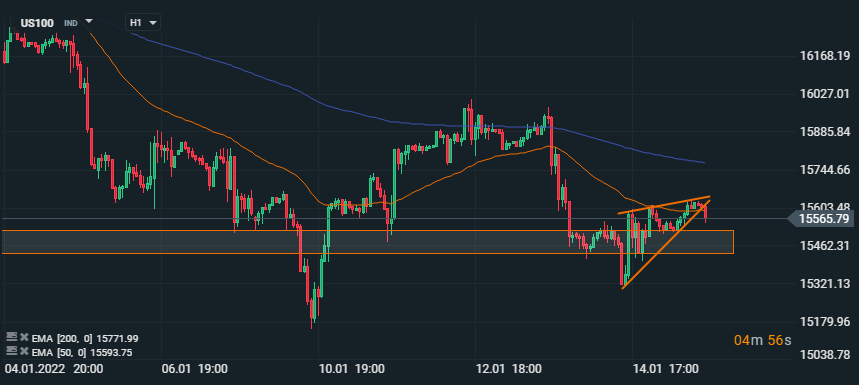 Din punct de vedere tehnic, pe graficul H1 al US 100 se observă apariția unui model bearish de Wedge. De obicei, acesta aduce o pauză a trendului predominant, care, în cazul nostru, este descendent. Astfel, spargerea în jos care a fost înregistrată în ultimele ore ar putea să deschidă drumul către o reluare a scăderilor. Totuși, vânzătorii au o misiune destul de dificilă pentru că ar trebui să spargă și zona de suport 15.435 - 15.525 de puncte (dreptunghiul portocaliu) pentru a putea viza o extindere a scăderilor. Pe de altă parte, cumpărătorii ar trebui să readucă prețul deasupra zonei de 15.600 de puncte, unde se află și media mobilă de 50 de perioade (linia portocalie), pentru a putea spera la o stabilizare.