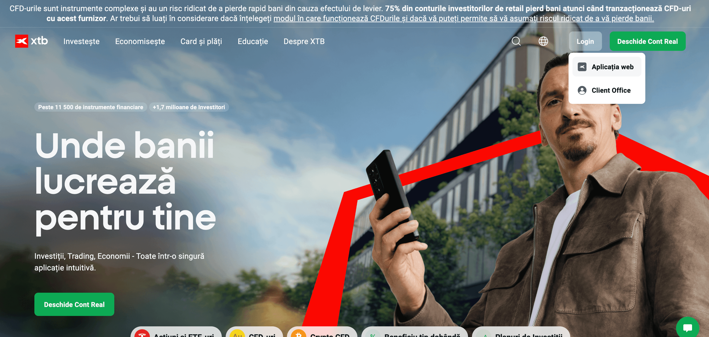 Pentru a utiliza xStation 5 este necesar să accesezi site-ul XTB https://www.xtb.com/ro și să te loghezi folosind butonul verde din colțul din dreapta sus. Poți alege să te conectezi la un cont real sau la un cont demo.