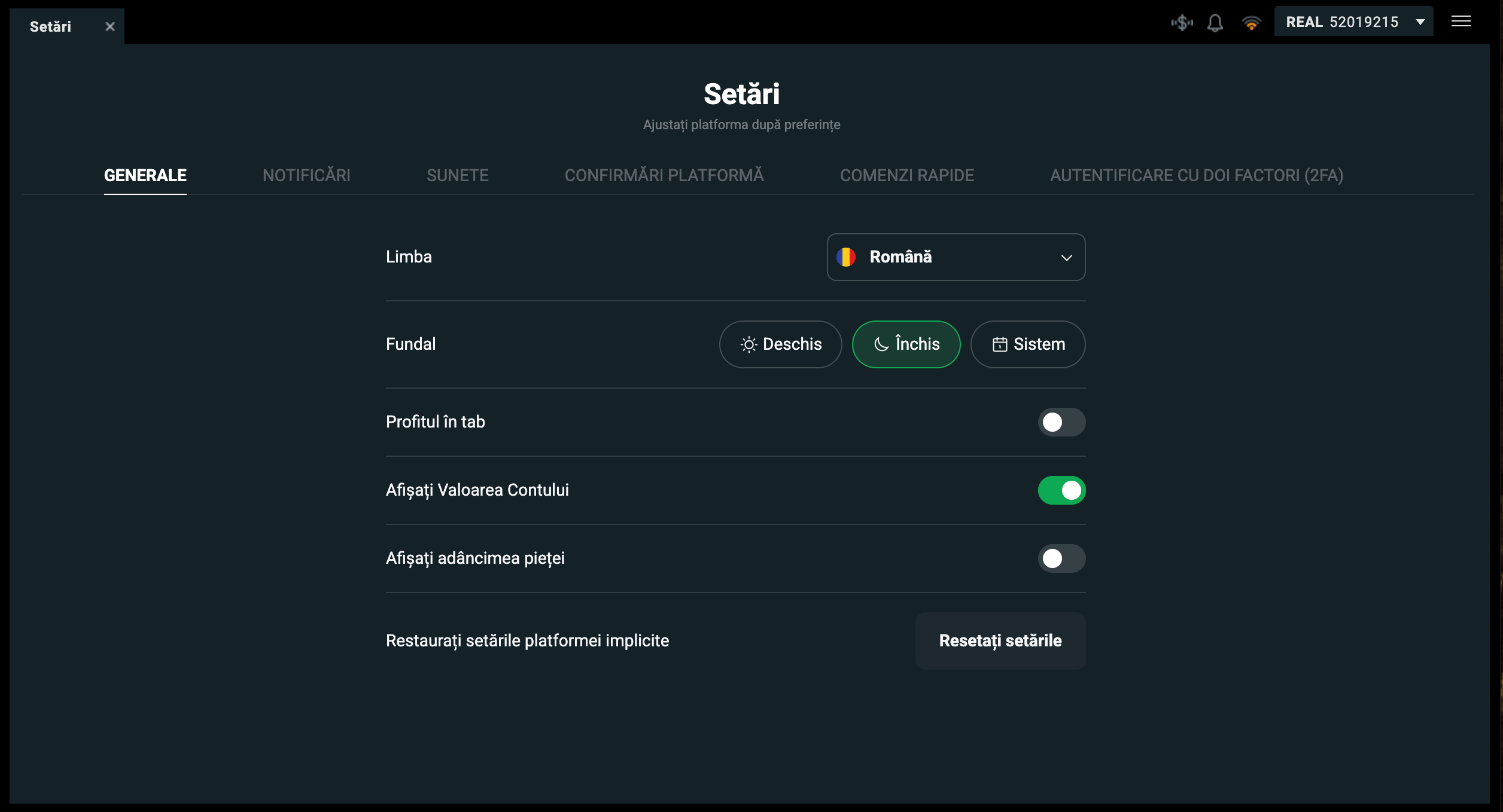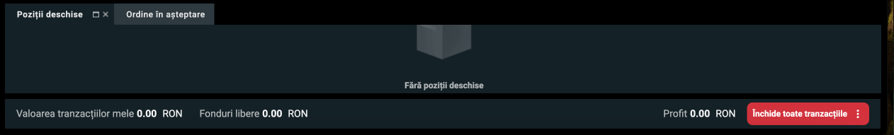 Această fereastră cuprinde informații despre pozițiile deschise, ordinele în așteptare, istoricul tranzacțiilor, operațiile cu numerar și statistici despre tranzacționare. Ai astfel posibilitatea să accesezi toate informațiile despre contul tău dintr-un singur loc.
