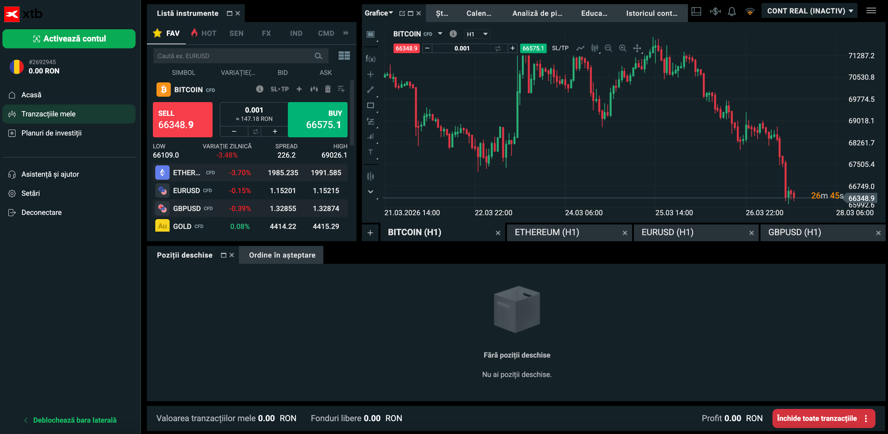 Interfața platformei xStation 5 prezintă în colțul din stânga fereastra Market Watch, în partea din dreapta graficul instrumentului selectat, iar în partea de jos fereastra Terminal.