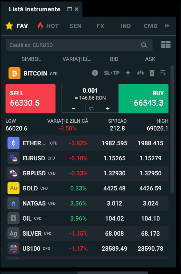 Această fereastră îți permite să selectezi instrumentele financiare în funcție de categoriilor principale (Listă instrumente: FX, CMD sau mărfuri, IND sau indici, EQ sau acțiuni, STK sau acțiuni sintetice și ETF). Poți de asemenea să îți creezi propria categorie (Favorite). Această fereastră îți permite și să tranzacționezi.