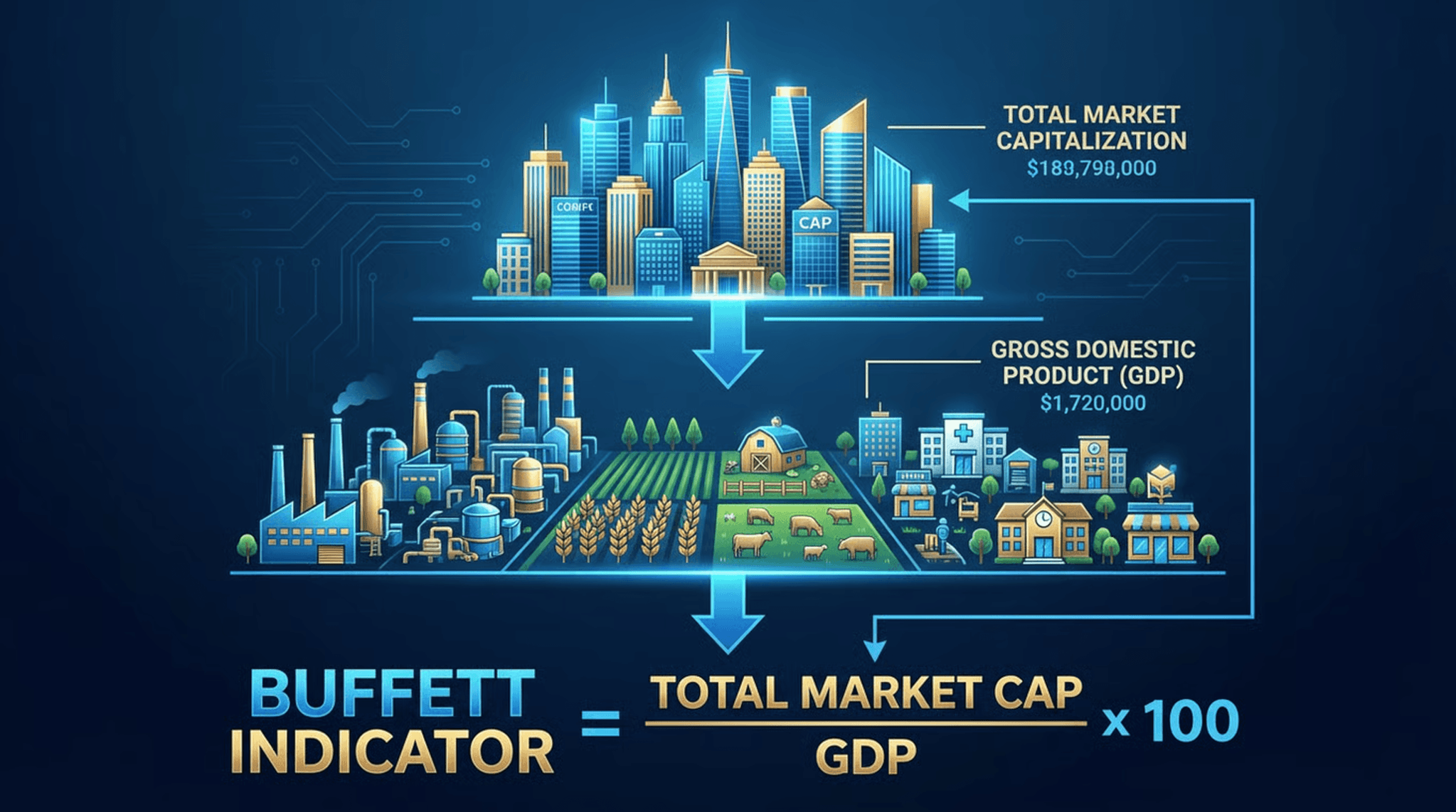 Buffett Indicator este raportul dintre capitalizarea totală a pieței bursiere și Produsul Intern Brut (PIB) al unei țări. Este important deoarece oferă o imagine rapidă asupra nivelului de evaluare al pieței de acțiuni - ajutând investitorii să aprecieze dacă piața este supraevaluată sau subevaluată în raport cu economia reală.