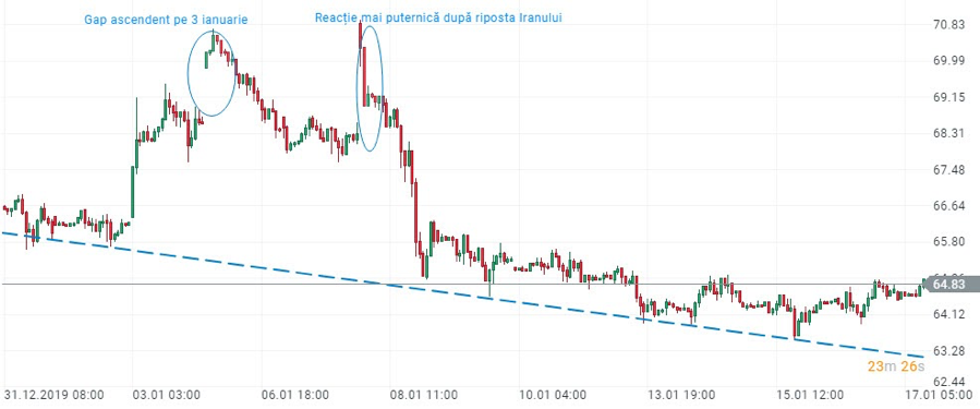 În ceea ce privește prețul petrolului, acesta a avut cele mai rapide reacții la evenimentele din planul geopolitic. Totuși, entuziasmul cumpărătorilor a dispărut rapid odată cu detensionarea relațiilor. Zona de la 70 USD are o importanță semnificativă pentru investitori întrucât a marcat sfârșitul mai multor impulsuri ascendente din ultimii ani, precum cele din septembrie 2019, ianuarie 2018 sau mai 2015. Mișcarea corectivă recentă a determinat o retragere de peste 10%, prețul petrolului atingând niveluri similare celor de la jumătatea lunii decembrie.