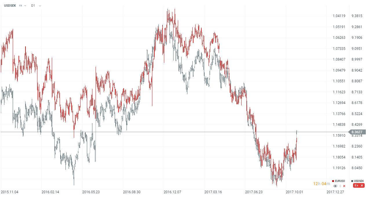 Corelația discutată în exemplul anterior nu este singura importantă. EURUSD ar putea evolua în tandem cu USDSEK, corelație determinată de doi factori. Înainte de toate, Suedia colaborează cu Uniunea Monetară Europeană, aceste economii fiind conectate. În al doilea rând, atât Banca Centrală Europeană, cât și Riksbank aplică politici monetare similare. Bineînțeles, cea din urmă ar putea să fie diferită, însă în ultimii 10 ani Banca Centrală din Suedia a fost cea care a urmat exemplul statelor europene. Acesta este motivul pentru care performanța SEK este similară cu cea EUR, iar performanța USDSEK pare similară cu cea a perechii valutare EURUSD. Aveți în vedere, totuși, corelația negativă dintre EURUSD și USDSEK. O mișcare de creștere a cotației EURUSD este de obicei urmată de o mișcare de scădere a cotației USDSEK. Atât EUR, cât și SEK se apreciază, dar cotațiile perechilor valutare evoluează în direcții diferite. Asta se numește o corelație puternic negativă.