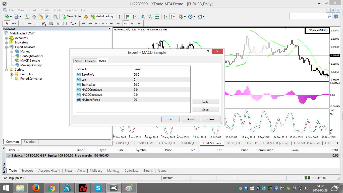 Acum este momentul să activezi aceste instrumente în platformă. După ce le-ai găsit, poți să folosești metoda drag and drop pe graficul pe care vrei sa le folosești. Mai departe se va deschide o nouă fereastră care îți va permite setarea parametrilor. În acest moment instrumentul de analiză ar trebui să fie activ. În cazul în care nu ești sigur dacă este activ sau nu, caută numele instrumentului în dreptul căruia ar trebui să fie și iconița ‘smiley face’ în colțul din dreapta sus al graficului.![]()