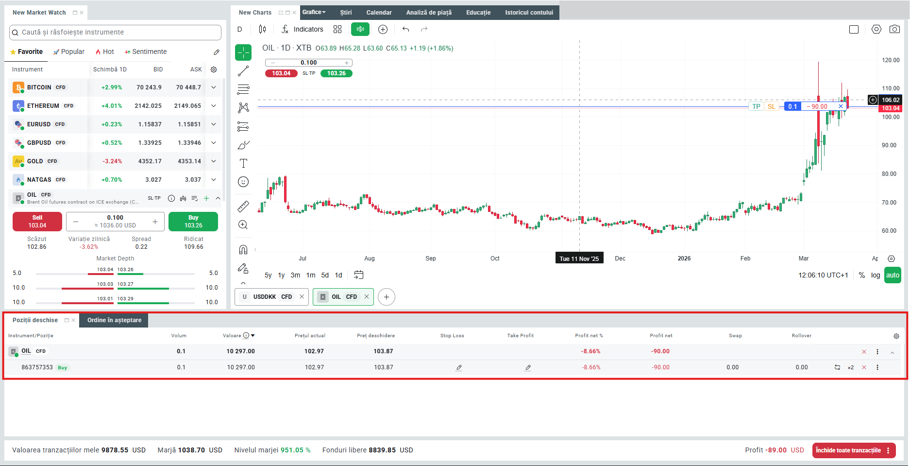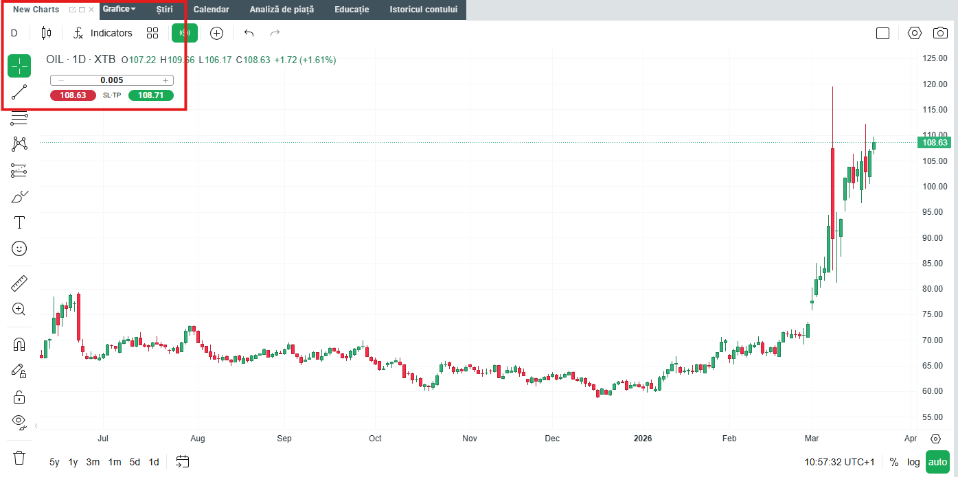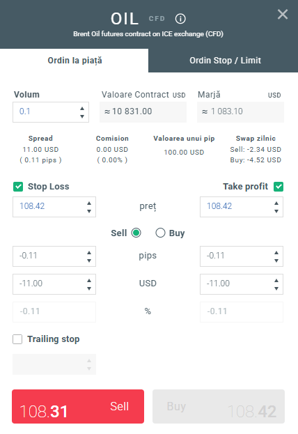 Cel mai simplu mod de a tranzacționa pe piața petrolului este de a utiliza platforma noastră de tranzacționare XTB, care este un instrument complet de tranzacționare și care îți oferă posibilitatea de a investi într-o gamă largă de instrumente financiare. Datorită calculatorului încorporat în fereastra de ordin, poți seta ordine de tip Stop Loss sau Take Profit în conformitate cu ipotezele rezultate din propria strategie de investiții.