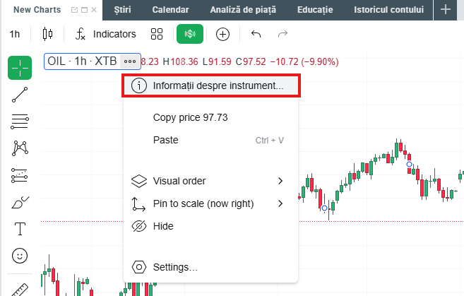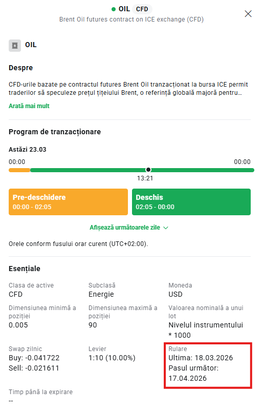 La XTB, CFD-urile pe petrol se bazează pe contracte futures listate la bursă, care expiră în fiecare lună. XTB oferă CFD-uri cu o dată de expirare de 365 de zile (nu se aplică CFD-urilor și ETF-urilor bazate pe acțiuni), astfel încât clienții noștri să nu fie nevoiți să închidă o poziție pe baza unei serii de contracte care expiră în fiecare lună și să deschidă alta. În acest fel, clienții pot continua, timp de până la 365 de zile, să păstreze un CFD pe baza prețului petrolului, fără a fi nevoiți să deschidă noi poziții în fiecare lună, așa cum este cazul pe piața de bază. De obicei, trecerea la următoarea serie de contracte (rulare sau rollover) are loc cu câteva zile înainte de data de expirare a seriei actuale de contracte futures pe piața de bază. Te vom informa cu privire la datele trecerilor viitoare în știrile comerciale. Data ultimei și următoarei treceri poate fi găsită și pe platforma noastră, făcând clic pe pictograma „Informații despre instrument” situată în fereastra click & trade.