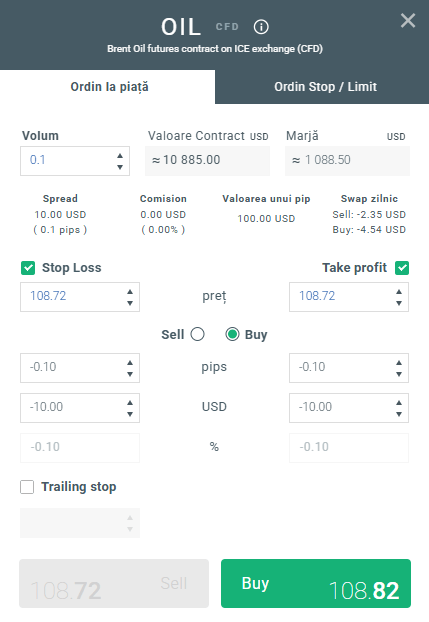 În primul rând, să ne uităm la modul de plasare a unui ordin de cumpărare cunoscut sub numele de poziție long. Să presupunem că, după analiza pieței, crezi că prețul petrolului va crește pe termen scurt. Inițial ar trebui să stabilești dimensiunea tranzacției. Apoi, ar trebui să configurezi un ordin Stop Loss pentru a îți limita pierderile potențiale și un ordin Take Profit care va închide poziția atunci când obții profitul scontat. Cel mai simplu mod de a intra într-o nouă tranzacție este prin selectarea alegerea poziției în fereastra click & trade care poate fi găsit în partea stângă a ecranului, în modulul Market Watch.