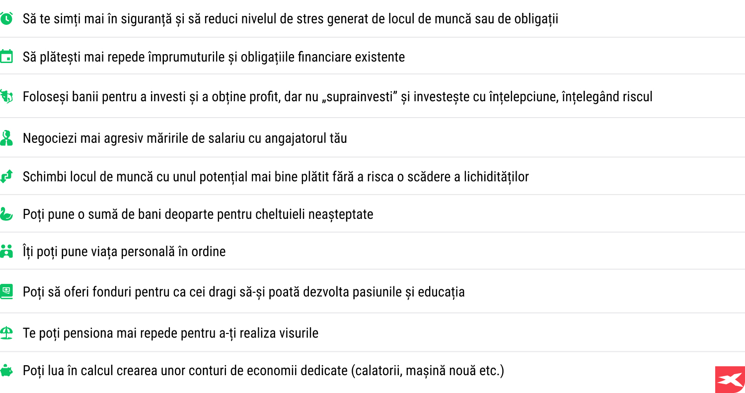 După cum am spus deja - economisirea este foarte importantă și este esențială pentru obținerea libertății financiare. Cu ajutorul economiilor, poți: