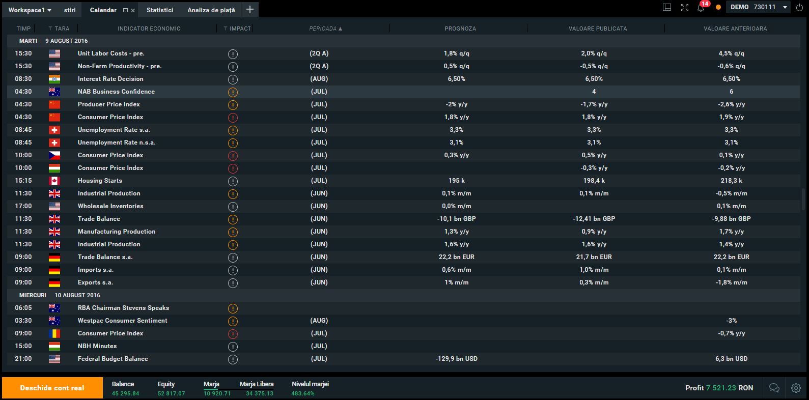 În afară de calendarul economic care se găsește pe www.xtb.com/ro traderii pot utiliza calendarul integrat în platforma de tranzacționare xStation fără a fi nevoie să apeleze la pagini externe. În calendarul xStation traderii pot găsi cele mai importante publicări macroeconomice pentru săptămânile ce urmează, împreună cu informații despre cât de semnificativă este o publicare macroeconomică și ce impact poate avea asupra piețelor. Semnele de exclamare roșii marchează cele mai importante publicări, cele portocalii indică publicările cu impact mediu, iar cele albe indică publicările cu impact redus.