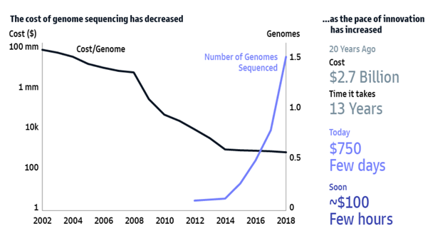 În anii 1990, costul procesului de secvențiere a genomului uman a fost ridicat, a ajuns la 2,7 miliarde de USD și a durat aproape 13 ani. Astăzi, costurile sunt de aproape 700 USD, iar procesul durează doar câteva zile.