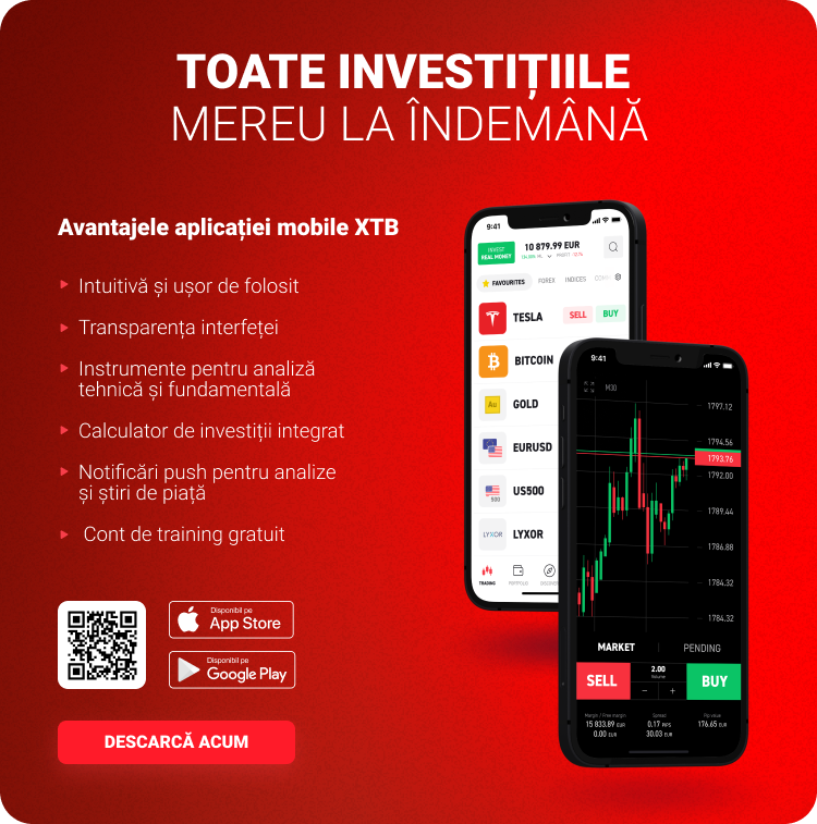 "Acest material este o comunicare de marketing în sensul articolului 24 alineatul (3) din Directiva 2014/65 / UE a Parlamentului European și a Consiliului din 15 mai 2014 privind piețele de instrumente financiare, și de modificare a Directivei 2002/92 / CE și a Directivei 2011 / 61 / UE (MiFID II). Comunicarea de marketing nu este o recomandare de investiții sau o recomandare de informații sau o recomandare care sugerează o strategie de investiții în sensul Regulamentului (UE) nr. 596/2014 al Parlamentului European și al Consiliului din 16 aprilie 2014 privind abuzul de piață ( reglementarea abuzului de piață) și de abrogare a Directivei 2003/6 / CE a Parlamentului European și a Consiliului și a Directivelor Comisiei 2003/124 / CE, 2003/125 / CE și 2004/72 / CE și a Regulamentului delegat (UE) 2016/958 al Comisiei din 9 596/2014 al Parlamentului European și al Consiliului în ceea ce privește standardele tehnice de reglementare pentru aranjamentele tehnice pentru prezentarea obiectivă a recomandărilor de investiții sau a altor informații care sugerează strategii de investiții și pentru dezvăluirea de interese particulare sau indicații de conflicte de interese sau orice alte sfaturi, inclusiv în domeniul consultanței în materie de investiții, în sensul Legii privind tranzacționarea cu instrumente financiare din 29 iulie 2005 (de ex. Journal of Laws 2019, articolul 875, astfel cum a fost modificat). Comunicarea de marketing este pregătită cu cea mai mare diligență, obiectivitate, prezintă faptele cunoscute autorului la data pregătirii și este lipsită de orice elemente de evaluare. Comunicarea de marketing este pregătită fără a lua în considerare nevoile clientului, situația sa financiară individuală și nu prezintă nicio strategie de investiții în niciun fel. Comunicarea de marketing nu constituie o ofertă de vânzare, oferire, abonament, invitație la cumpărare, reclamă sau promovare a oricărui instrument financiar. XTB SA nu este responsabilă pentru acțiunile sau omisiunile niciunui client, în special pentru achiziționarea sau cedarea instrumente, întreprinse pe baza informațiilor conținute în această comunicare de marketing. XTB SA nu va accepta răspunderea pentru nicio pierdere sau daună, inclusiv, fără limitare, orice pierdere care poate apărea direct sau indirect, efectuată pe baza informațiilor conținute în această comunicare de marketing. În cazul în care comunicarea de marketing conține informații despre orice rezultat cu privire la instrumentele financiare indicate în acestea, acestea nu constituie nicio garanție sau prognoză cu privire la rezultatele viitoare. Performanțele anterioare nu indică neapărat rezultatele viitoare și orice persoană care acționează pe baza acestor informații o face pe propriul risc. Acest material nu este emis pentru a influenta deciziile de tranzacționare ale niciunei persoane. Informațiile cuprinse în cadrul acestui material nu sunt prezentate pentru a fi aplicate, copiate sau testate în cadrul tranzacțiilor dumneavoastră. Informațiile cuprinse în cadrul acestui material sunt emise în baza experienței proprii a emitentului și nu reprezintă o recomandare individuală, nu vizează atingerea anumitor obiective, randamente financiare și nu se adresează nevoilor niciunei persoane anume care ar primi-o. Premisele acestui material nu au în vedere situația și persoana dumneavoastră deci nu recomandăm utilizarea acestor informații sub orice formă. Utilizarea informațiilor cuprinse în cadrul acestui material în orice modalitate se face pe propria dumneavoastră răspundere. Acest material este emis de către un analist pentru care își asumă răspunderea XTB SA, persoană juridică autorizată de KNF – Autoritatea de Supraveghere Financiara din Polonia."