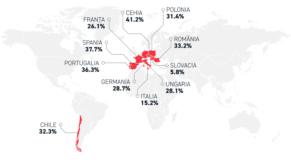 Procentul celor care investesc în monede virtuale din totalul investitorilor, în funcție de țară