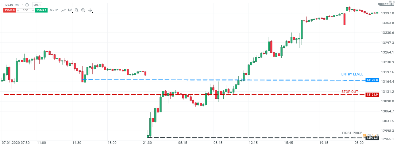 Un investitor a deschis o tranzacție de tip long (de cumpărare) pe DE30 (activ de bază DAX) și dorește să o mențină deschisă peste weekend. Luni, piața a deschis cu un gap bearish (în scădere) din cauza instabilității politice, așadar prețul de deschidere a fost mult mai mic decât prețul de închidere de vineri, fapt pentru care investitorul nu doar că a pierdut întregul capital investit, ci a și acumulat datorii suplimentare.