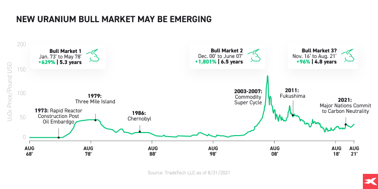 Analizând graficul istoric al prețurilor uraniului, putem concluziona că această marfă se află într-un boom ciclic și prețul său crește exponențial în fața factorilor de preț favorabil. Mercenarul geolog Mickey Fulp a ajuns la o concluzie similară, el a subliniat că uraniul este o marfă în plină expansiune și explozie, ceea ce înseamnă că la fiecare deceniu și ceva, prețul crește și apoi scade. Graficul de mai jos prezintă un rezumat al bulelor istorice în prețul uraniului.