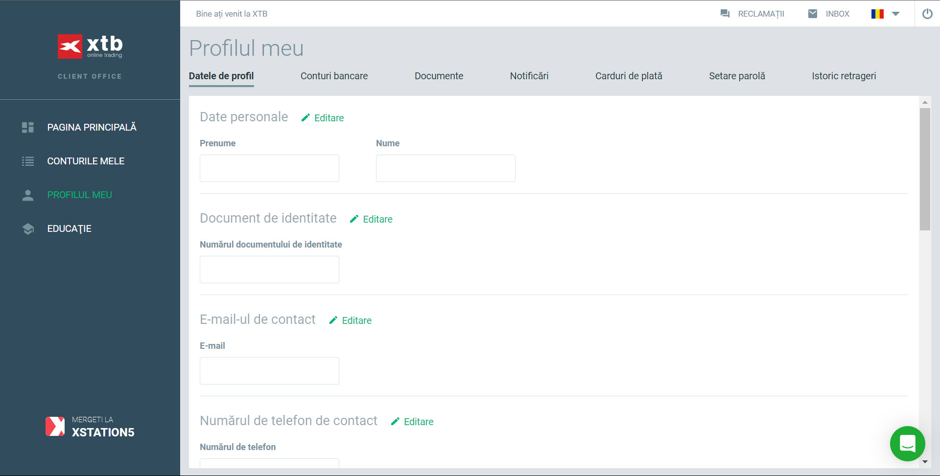 Te conectezi în Client Office folosind aceleași date de conectare ca și pentru contul tău din platforma XTB (e-mail și parolă), apoi accesezi tab-ul Profilul meu.
