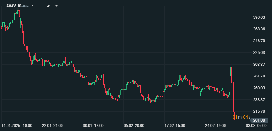 Akcie AeroVironment (AVAV) sa 2. marca 2026 prepadli približne o 18–20 % po tom, čo sa ranný rast rýchlo zmenil na výrazný výpredaj. Hlavným spúšťačom bolo zníženie odporúčania od Raymond James na Underperform, ktoré opäť upriamilo pozornosť na neistotu okolo programu SCAR (U.S. Space Force) a jeho dopad na backlog aj viditeľnosť budúcich tržieb. Zdroj: xStation5