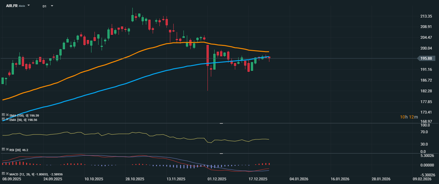 Akcie spoločnosti Airbus (AIR.FR) sa aktuálne obchodujú na úrovni 195,88 EUR a technicky sa nachádzajú v neutrálnom až mierne negatívnom nastavení. Cena zostáva pod oboma kĺzavými priemermi – EMA 50 (198,56 EUR) a SMA 100 (196,59 EUR), čo naznačuje, že trhu zatiaľ chýba silný rastový impulz. RSI sa pohybuje na úrovni 46,2, teda mierne pod neutrálnou úrovňou a nesignalizuje ani prekúpenie, ani prepredanosť. Trh je tak technicky pripravený na pohyb ktorýmkoľvek smerom v závislosti od ďalších impulzov.