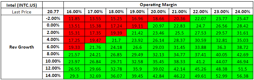 Vypočítali sme priemerné, mediánové, ako aj kapitalizačne vážené násobky pre porovnateľnú skupinu. Neskôr sme vypočítali tri rôzne ocenenia spoločnosti Intel pre každý z týchto násobkov. Ako vidieť v tabuľke, prevažná väčšina z nich naznačuje, že akcie spoločnosti Intel sú pri súčasných cenách podhodnotené. Viacnásobné ocenenie však môže spoločnosť nadhodnocovať, keďže podobné spoločnosti pracujú s vyššími maržami.