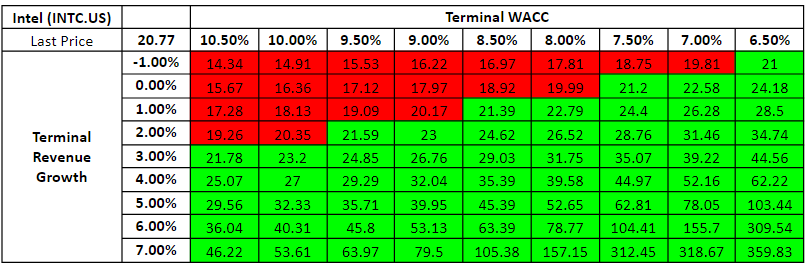 Keďže terminálna hodnota má tendenciu tvoriť významnú časť ocenenia DCF, najmä pri kratších obdobiach podrobných prognóz, rozhodli sme sa tu zvoliť veľmi konzervatívny prístup. Pri výpočtoch terminálnej hodnoty sme použili 3-percentný rast tržieb (keďže podnik je rozvinutý), ako aj 8,5-percentný terminálny WACC, čo je menej ako 9-percentný WACC použitý pri päťročných prognózach. Zníženie terminálneho WACC vychádza z toho, že Intel bude čoskoro rozvinutou spoločnosťou, ktorá nebude môcť rásť tak rýchlo a mohla by sa stať finančne stabilnejšou vďaka nižším nákladom na podnikanie v oblasti výroby.