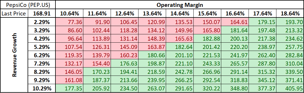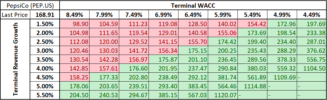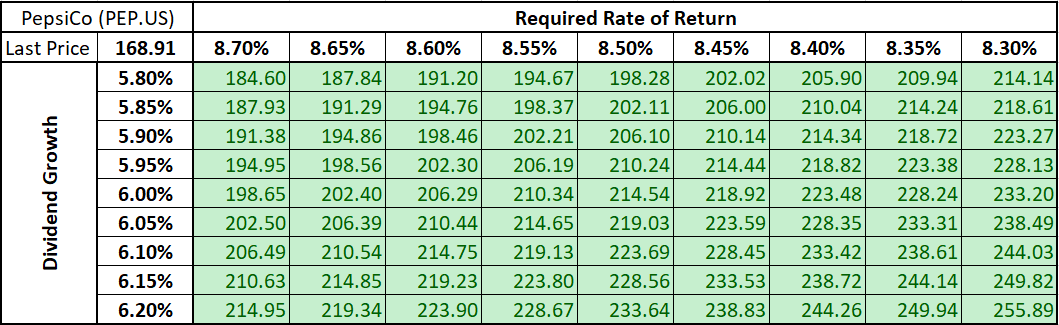 Spoločnosť PepsiCo ako spoločnosť s dlhou a solídnou históriou delenia sa o zisky s akcionármi prostredníctvom dividend možno oceniť pomocou Gordonovho rastového modelu. Spoločnosť PepsiCo zvyšuje svoju dividendu už 51 rokov po sebe. Štvrťročná dividenda na rok 2023 bola zvýšená o 10 %, z 1,15 USD na 1,265 USD. To predstavuje ročnú dividendu vo výške 5,06 USD na akciu. Hoci sa dividenda tento rok zvýšila o 10 %, ide o nadpriemerné zvýšenie a rast dividend spoločnosti sa v posledných rokoch blížil k 6 %. Ak použijeme 8,5 % ako požadovanú mieru návratnosti (5-ročné priemerné náklady na vlastný kapitál), ako aj ročnú dividendu vo výške 5,06 USD a rast dividend na úrovni 6,0 % ako vstupy pre Gordonov model rastu, dostaneme sa k oceneniu spoločnosti PepsiCo na úrovni 214,54 USD na akciu - čo je o 27 % viac ako súčasná trhová cena.