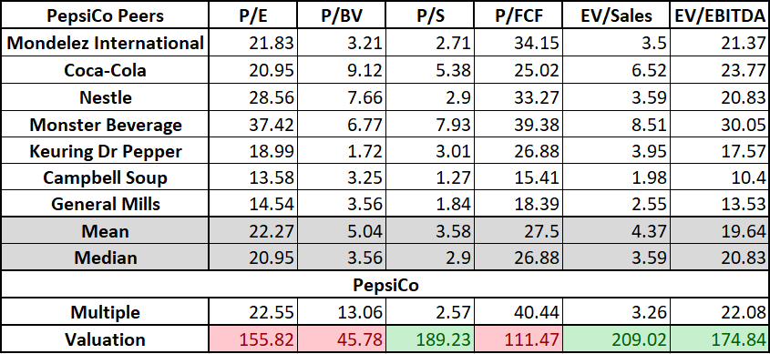 Ďalej sa pozrime na násobky spoločnosti PepsiCo a jej podobných spoločností. Vybraná skupina porovnateľných spoločností nie je úplne homogénna, keďže podnikanie spoločnosti PepsiCo je takmer 50 % rozdelené medzi občerstvenie a nápoje. Vzhľadom na to sme zahrnuli hlavných rovesníkov spoločnosti PepsiCo z oboch odvetví (niektorí z nich pôsobia v oboch). Do tejto skupiny patria spoločnosti Coca-Cola, Nestle, Mondelez International, Monster Beverage, Keurig Dr Pepper, Campbell Soup a General Mills.