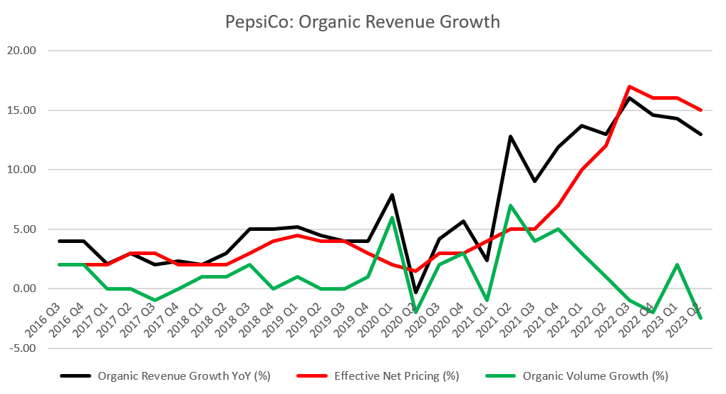 Rast organických príjmov spoločnosti PepsiCo bol v posledných štvrťrokoch spôsobený najmä priaznivým cenovým mixom. Zdroj: xStation5