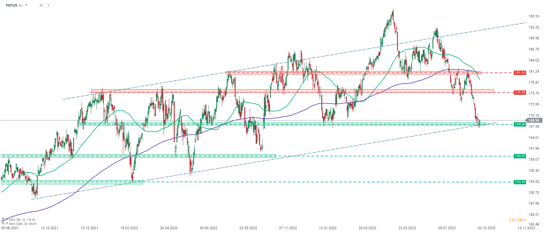 Na záver sa pozrime na graf spoločnosti PepsiCo (PEP.US) v intervale D1. Vidíme, že akcie sa v poslednom čase obchodujú pod tlakom a z júlových maxím klesli o viac ako 10 %. Napriek tomu sa býkom podarilo zastaviť výpredaj v zóne podpory 168,00 USD, kde sa nachádza spodná hranica býčieho kanála. Ide o býčí vývoj, treba však poznamenať, že ho umožnilo včerajšie celkové zlepšenie chuti riskovať vďaka stiahnutiu výnosov. Cena akcií spoločnosti sa bude pravdepodobne naďalej riadiť faktormi celého trhu až do utorka budúceho týždňa, keď väčšiu úlohu zohrajú faktory špecifické pre spoločnosť (výsledky za 3. štvrťrok 2023). Ak by spoločnosť opäť prekonala očakávania trhu, čo by vyvolalo tlak na rast ceny jej akcií, zónu krátkodobej rezistencie, ktorú treba sledovať, možno nájsť v oblasti 176,00 USD za akciu.