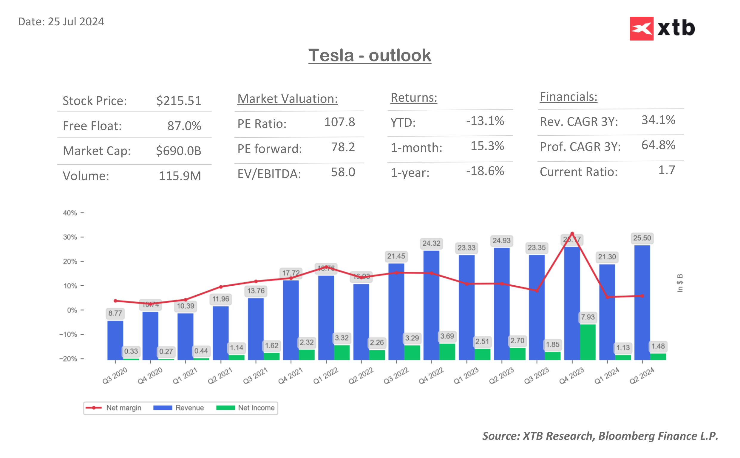 Spoločnosť Tesla (TSLA.US) tento týždeň po zverejnení výsledkov za 2. štvrťrok 2024 zaznamenala pokles. Akcie sa v stredu prepadli o viac ako 12 %, čo predstavuje najväčší jednodňový pokles od septembra 2020! Správa bola sklamaním, ale bola naozaj taká zlá, aby ospravedlnila takýto výrazný pokles? Pozrime sa na zverejnenie, ocenenie spoločnosti Tesla v porovnaní s ostatnými spoločnosťami a situáciu na grafe!