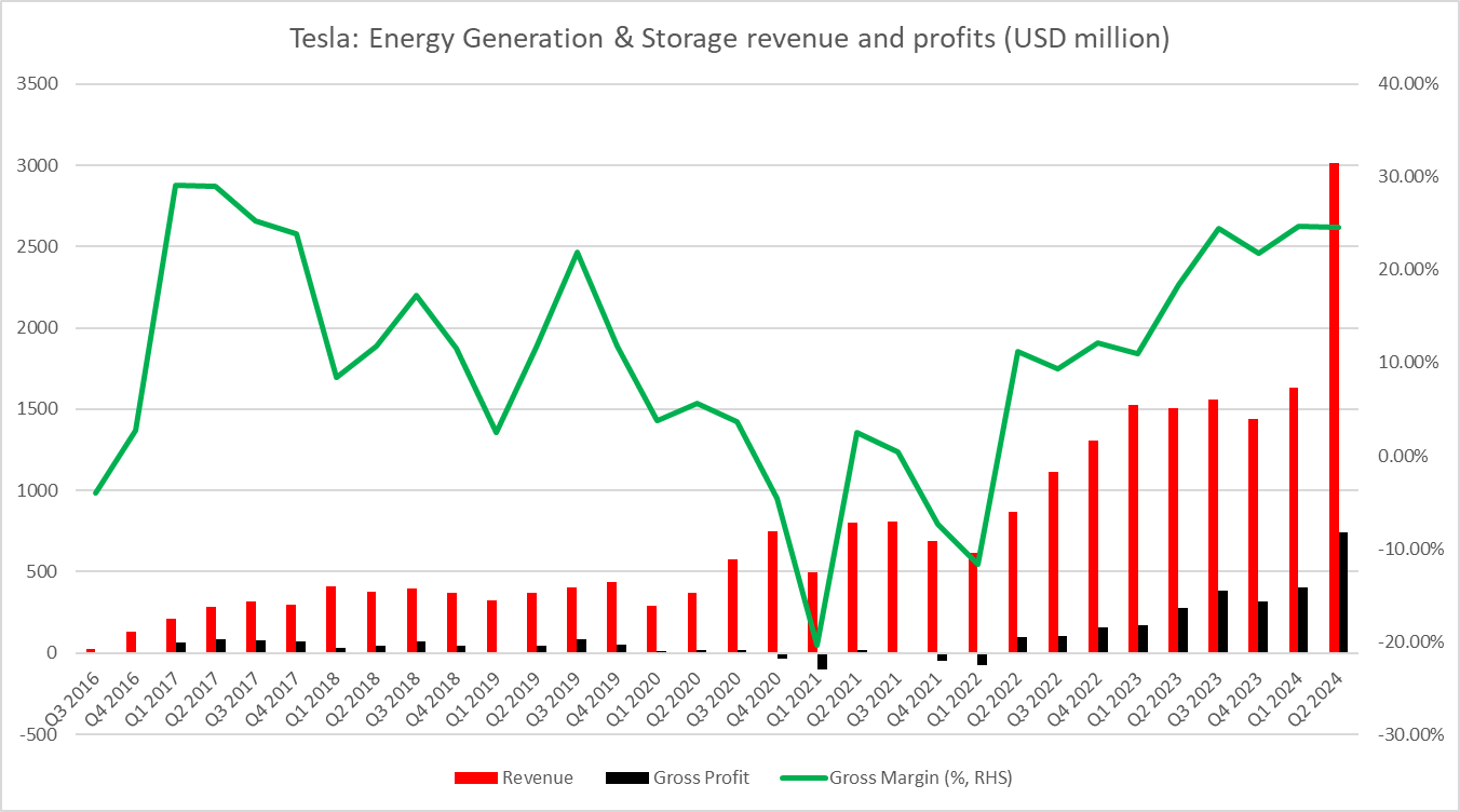 Pri pohľade na titulné výsledky sa možno pýtať, odkiaľ pochádza zlepšenie tržieb, ak spoločnosť Tesla zaznamenala výrazné zhoršenie v oblasti automobilového priemyslu. Odpoveďou je segment výroby a skladovania energie. Ide o segment, ktorý zahŕňa výrobu solárnej energie a systémy skladovania batérií spoločnosti Tesla. Rast tržieb tohto segmentu dosiahol v 2. štvrťroku 2024 medziročne takmer 100 %, keďže spoločnosť v tomto štvrťroku zrealizovala rekordných 9,4 GWh nasadenia. Prudký nárast tržieb sprevádzal aj prudký nárast hrubého zisku segmentu, pričom hrubá marža segmentu sa oproti 1. štvrťroku 2024 prakticky nezmenila. V porovnaní s kvartálom spred roka (2. štvrťrok 2023) sa však hrubá marža segmentu Výroba a skladovanie energie zlepšila o približne 600 bázických bodov!