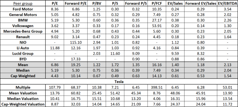 Aj keď sa očakáva, že podnikanie spoločnosti Tesla sa bude v budúcnosti zlepšovať, investovanie do akcií predstavuje veľké riziko. Hlavným z nich je jej veľmi vysoké ocenenie. Násobky spoločnosti Tesla a jej podobných spoločností, ako aj ocenenia založené na týchto násobkoch, nájdete v nasledujúcej tabuľke. Ako vidieť, aj po včerajšom výpredaji sa Tesla obchoduje s oveľa vyššími násobkami akcií ako tradičné automobilky (Ford, GM, BMW, Volkswagen, Mercedes, Renault) alebo výrobcovia elektrických vozidiel (NIO, Li Auto, Lucid Group, BYD). Rozdiel medzi násobkami spoločnosti Tesla a priemermi, mediánmi a násobkami váženými kapitalizáciou pre porovnateľné skupiny je obrovský. Všimnite si, že použitie aj najvyššieho ocenenia na základe priemerného násobku Forward P/E (60,82 USD na akciu) naznačuje viac ako 70 % pokles oproti súčasným trhovým cenám!