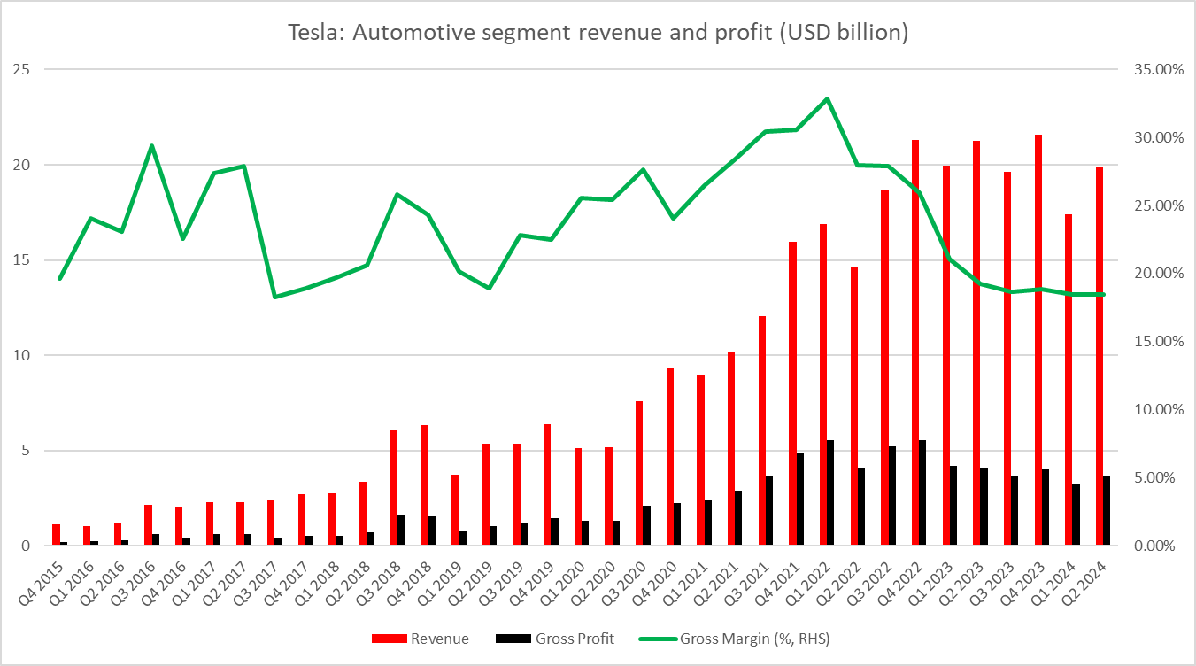 Zhoršenie marží je negatívnym bodom správy o výsledkoch spoločnosti Tesla za 2. štvrťrok 2024. Hoci sa hrubá marža zhoršila o 20 bázických bodov, z 18,2 % na 18,0 %, hrubá marža spoločnosti v jej kľúčovom automobilovom segmente zostala viac-menej nezmenená na úrovni približne 18,5-19,0 % už piaty štvrťrok po sebe. Spoločnosť Tesla však uviedla, že počas štvrťroka vykázala rekordné príjmy z regulačných úverov. Marža spoločnosti v kľúčovom automobilovom sektore, bez vplyvu predaja regulačných úverov, v skutočnosti dosiahla v 2. štvrťroku 2024 len 14,6 %!