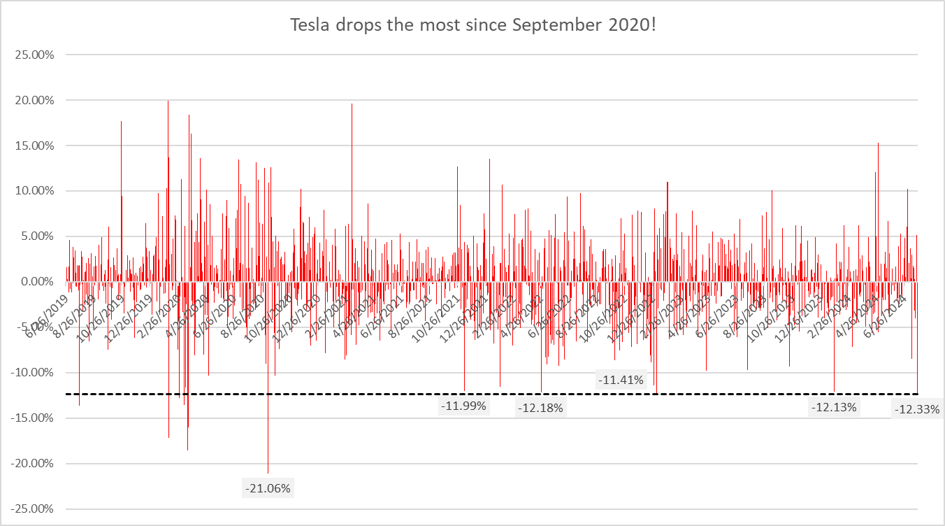 Zverejnenie správy vyvolalo veľký prepad ceny akcií spoločnosti Tesla. Akcie spoločnosti sa v utorok počas poobchodnej seansy prepadli o približne 8 % a v poklese pokračovali aj počas stredajšej hotovostnej seansy na Wall Street. Akcie ukončili stredajšie obchodovanie o 12,3 % nižšie! Hoci spoločnosť Tesla zažila niekoľko poklesov podobného rozsahu v rokoch 2022, 2023 a na začiatku roka 2024, na to, aby sme našli väčší jednodňový pokles, by sme museli ísť až do roku 2020, keď akcie 8. septembra 2020 uzavreli o viac ako 21 % nižšie.