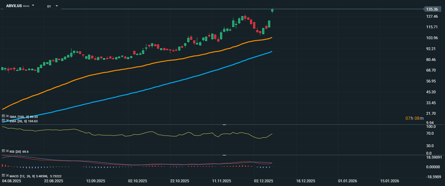 Akcie spoločnosti Abivax pokračujú v dynamickom raste a aktuálne sa obchodujú na úrovni 135,36 USD, čo predstavuje nové historické maximum. Cena akcie sa drží vysoko nad kĺzavými priemermi – EMA 50 (104,63 USD) aj SMA 100 (89,33 USD) jasne rastú a podporujú dlhodobý býčí trend. RSI je na úrovni 69,6, teda tesne pod hranicou prekúpenosti (70), čo naznačuje silné momentum, no zároveň možnosť krátkodobej korekcie.