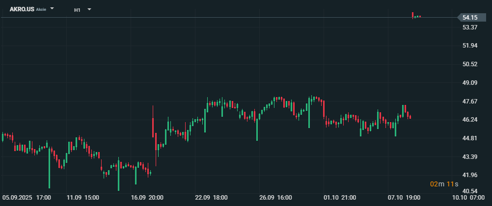 Akcie Akero posilnili o 16–19 %, pričom sa priblížili k úrovni 54 USD za akciu. Akcie Novo Nordisk naopak mierne klesli o 1,6–2,5 % kvôli obavám investorov z vplyvu na ziskovosť a zadlženie. Zdroj: xStation5