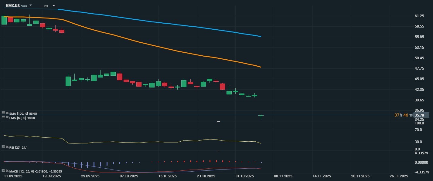 Akcie CarMax sa aktuálne obchodujú za 35,78 USD a naďalej sa nachádzajú vo výraznom klesajúcom trende. Cena je hlboko pod kĺzavými priemermi – EMA 50 (48,08 USD) a SMA 100 (55,95 USD), čo potvrdzuje dlhodobo negatívne technické nastavenie. RSI klesol na úroveň 24,1, čím sa dostal do pásma prepredanosti.