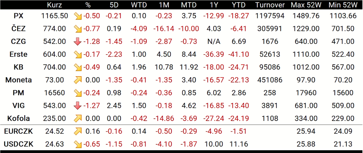 Nejvýkonnějším titulem pražského indexu se dnes stala Moneta (MONET.CZ), která bude ve čtvrtek 27.10. zveřejňovat výsledky hospodaření. Akcie banky se dnes obchodovaly do strany a uzavřely na 73 Kč za akcii. Největší ztráty si připasaly akcie České zbrojovky (CZG.CZ) a Vienna Insurance Group (VIG.CZ), přičemž obě společnosti ztratily téměř 1,30 %. Po uzavření pražské seance, ministr financí Zbyněk Stanjura v poslanecké sněmovně potvrdil, že v letošním roce se Windfall tax na energetiku, banky a rafinerie uplatňovat nebude. Přestože je toto stanovisko v akciích ČEZ (CEZ1.CZ) již z minulého týdne zaceněno, mohlo by vyvolat mírnou pozitivní reakci, která může nastat na počátku zítřejší seance. Nejztrátovější bankou dnes byla Komerční banka (KOMB.CZ), která přišla o 0,49 % své tržní kapitalizace.