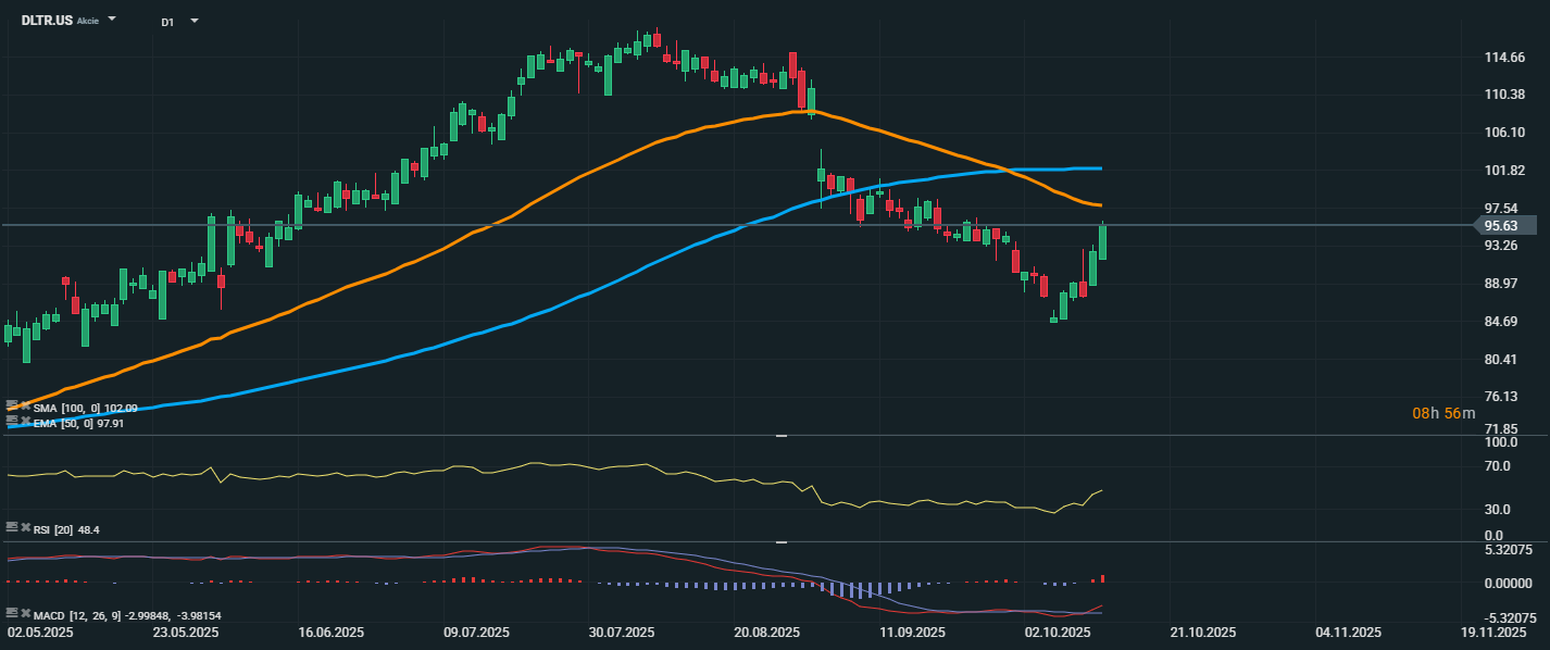 Akcie spoločnosti Dollar Tree zaznamenali v posledných dňoch prudký rast a aktuálne sa obchodujú na úrovni 95,63 USD, čím sa priblížili k úrovni kĺzavého priemeru EMA 50 (97,91 USD). Technicky však cena zatiaľ zostáva pod EMA 50 aj SMA 100 (102,09 USD), čo znamená, že z pohľadu strednodobého trendu sa stále nachádza v korekčnej fáze. RSI na hodnote 48,4 naznačuje neutrálnu zónu, pričom stále existuje priestor pre rast bez prekúpenosti. MACD začína zlepšovať svoju trajektóriu, hoci hodnoty zostávajú záporné, čo naznačuje, že potvrdenie obratu trendu zatiaľ chýba.