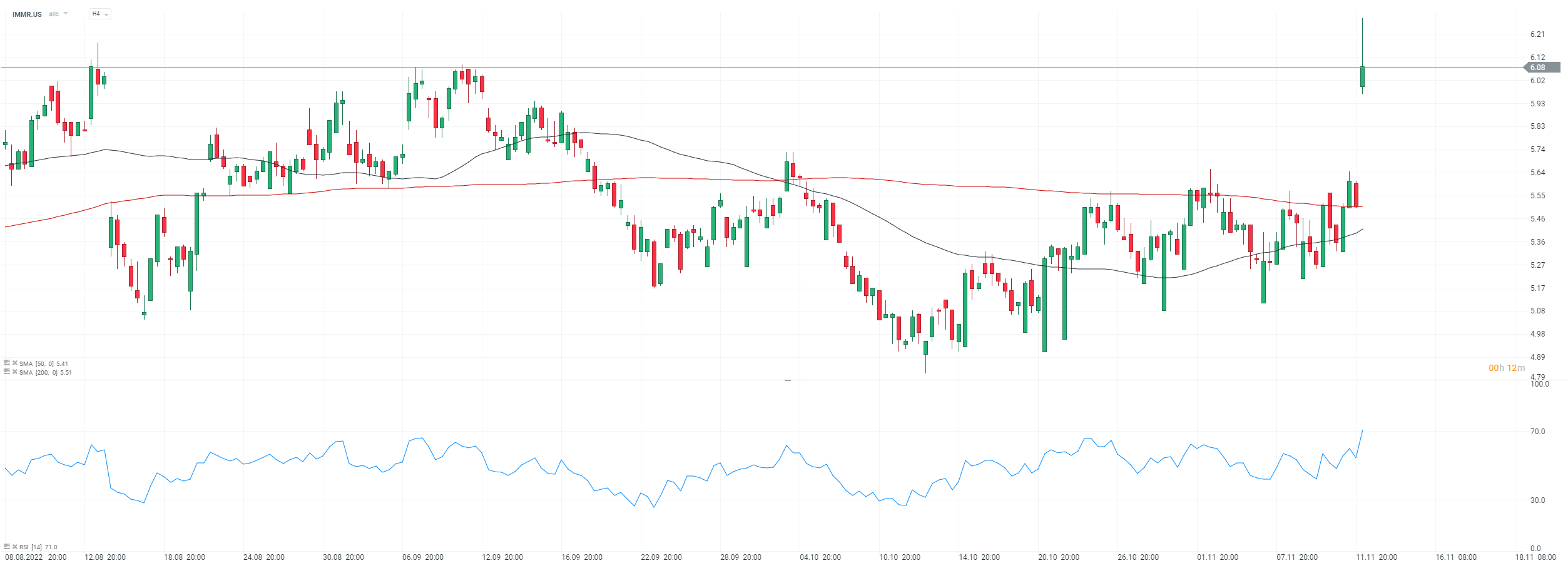 Akciový graf Immersion (IMMR.US), interval D1. Akcie společnosti dnes otevřely růstem. Průměry SMA50 a SMA200, pokud budou pokračovat v nastoleném trendu, směřují k průsečíku, který fanoušci AT nazývají takzvaný "zlatý kříž". Tato formace je obvykle zpožděným indikátorem obratu trendu. Immersion si i přes svou malou kapitalizaci letos vedla lépe než index NASDAQ a většina technologických společností. Od 1. ledna 2022 si akcie připsaly téměř 5 %. Společnost nemá žádné dluhy. Její poměr dluhu k vlastnímu kapitálu k 30. červnu 2022 byl 0. Díky prodeji duševního vlastnictví se společnost může pochlubit významnou čistou marží přesahující 50 %. Potenciálně to však představuje určité riziko, protože většina příjmů společnosti závisí na tržních faktorech a globální poptávce po haptických technologiích. Zdroj: xStation5