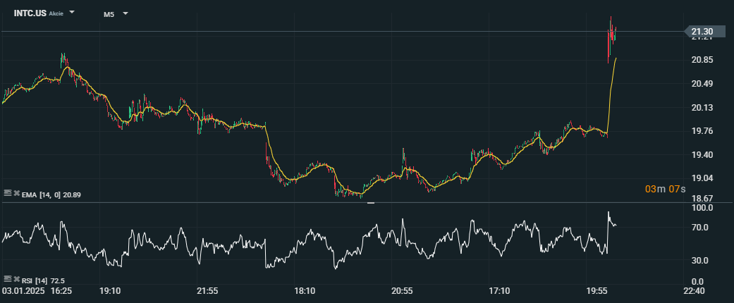 Vývoj akcií Intelu (INTC.US) na 5-minútovom grafe s indikátormi Exponenciálny kĺzavý priemer (EMA, perióda 14) a Index relatívnej sily (RSI, perióda 14). Akcie prudko vzrástli o 9,5 % a dosiahli hodnotu 21,30 USD v reakcii na správy o možnej investícii 5 miliárd USD od Apollo Global Management. RSI sa zvýšilo na úroveň 72,5, čo signalizuje prekúpený trh. Zdroj: xStation5