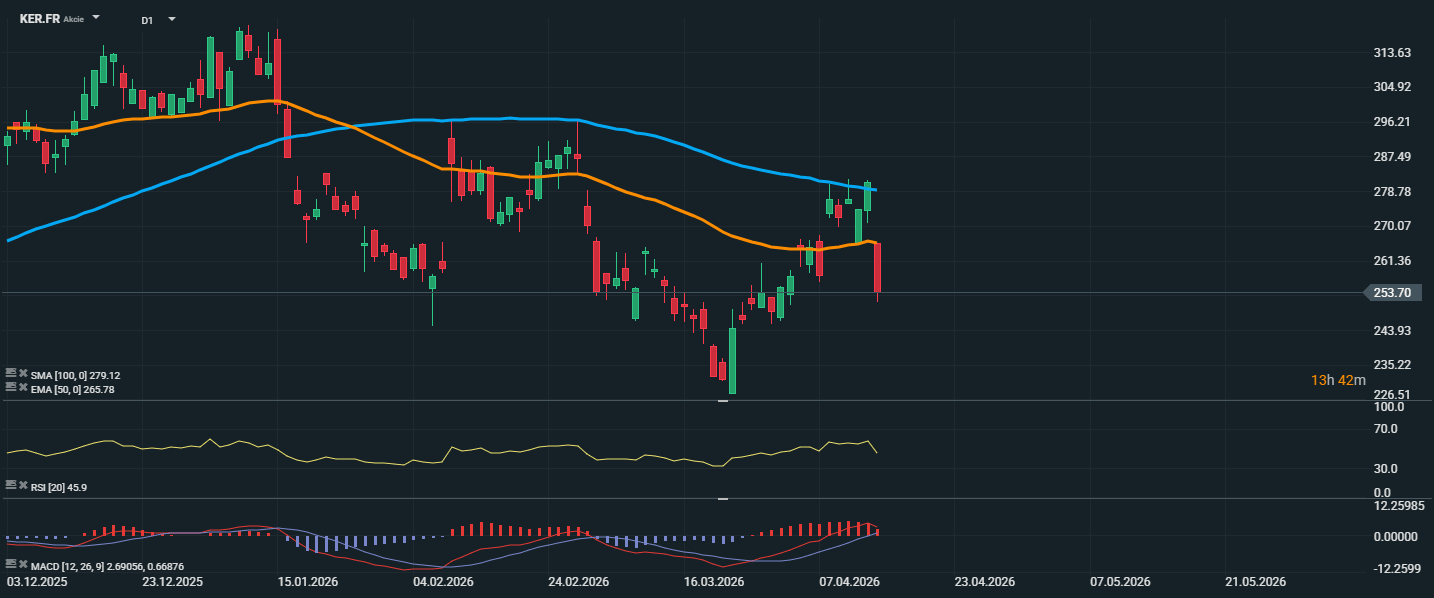 Akcie Keringu sa aktuálne obchodujú okolo 253,70 EUR a po prudkom prepade sa dostali pod EMA 50 na 265,78 EUR, pričom zároveň zostávajú aj pod SMA 100 na 279,12 EUR. To potvrdzuje, že strednodobý technický obraz zostáva naďalej medvedí. Posledný rastový pokus bol výrazne odmietnutý práve v blízkosti 100-dňového kĺzavého priemeru a následný silný pokles ukazuje na pokračujúcu prevahu predajcov. RSI sa nachádza na hodnote 45,9, teda pod neutrálnou hranicou, čo signalizuje slabnúcu silu kupcov bez dosiahnutia prepredanej zóny. MACD síce zostáva tesne v kladnom teritóriu, histogram však slabne, čo naznačuje vyčerpanie predchádzajúceho rastového momenta a riziko ďalšieho tlaku smerom nadol. Z technického pohľadu bude dôležité, či sa titul udrží nad supportom okolo 253 EUR. Ak nie, môže sa otvoriť priestor pre pokles smerom k oblasti 244 až 235 EUR. Na zlepšenie výhlaďu by sa naopak bolo potrebné vrátiť späť nad 266 EUR.