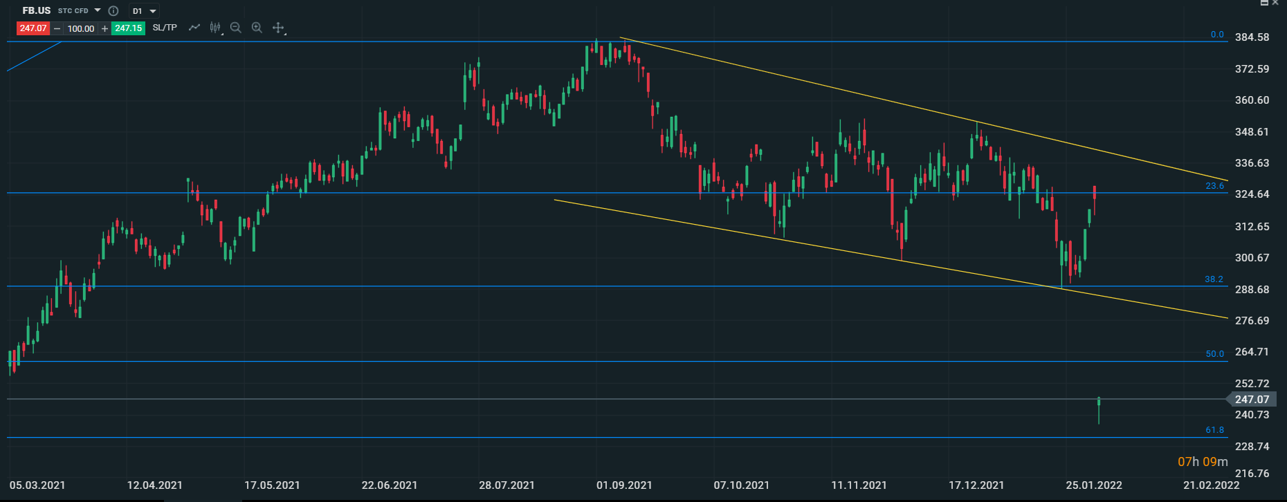 Akcie Meta (FB.US) dnes otvorili seansu s masívnym medvedím cenovým rozdielom. Ak prevládne súčasný sentiment, ďalší cieľ pre predajcov sa nachádza na úrovni 232,00 USD, ktorý sa vyznačuje 61,8% Fibonacciho retracementom vzostupnej vlny začatej v marci 2020. Zdroj: xStation5