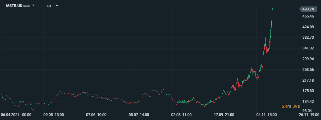 Akcie spoločnosti MicroStrategy (MSTR.US) vzrástli o 15 % na 494 USD, čo predstavuje nové 52-týždňové maximum, v reakcii na rast Bitcoinu, ktorý dosiahol 94 000 USD. Firma je najväčším korporátnym držiteľom Bitcoinu, s celkovým objemom 331 200 BTC v hodnote približne 31 miliárd USD. Pod vedením Michaela Saylora MicroStrategy zrealizovala odvážnu stratégiu nákupu Bitcoinu, financovanú emisou dlhopisov a akcií v hodnote 6,6 miliardy USD. Trhová kapitalizácia spoločnosti teraz presahuje kombinovanú hodnotu dvoch najväčších ťažiarov zlata, Barrick Gold a Newmont Corporation. Hoci je stratégia považovaná za ambicióznu, prináša vysoké riziká spojené s prémiou, ktorú investori platia za akcie MSTR oproti reálnej hodnote drženého Bitcoinu.