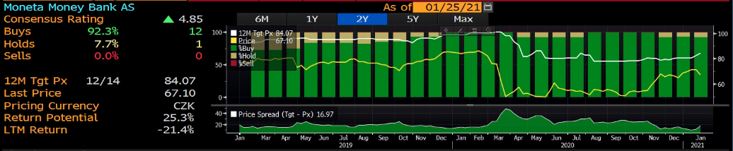 Analytici Bloombergu doporučují banku Moneta ke koupi. Cílová 12 měsíční cena je nastavena na 84,07 Kč. Všechny doporučení se však datují před zveřejnění zájmu společnosti PPF o Monetu. Zdroj: Bloomberg