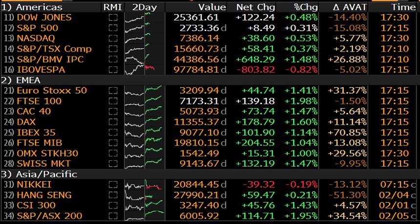 Akcie po krátkej pauze pokračujú v raste. Hlavné európske indexy rastú o zhruba 1,5%. Podporila aj ich revízia januárových indexov dôvery v službách. Index pre celú eurozónu bol revidovaný nahor z 50,8b. na 51,2b. Síce je to stále len mierna expanzia, pozitívna správa potešila investorov, ktorým pomáhajú centrálne banky holubičími komentármi. V USA bola reakcia slabšia, hlavné indexy rastú len o zhruba pol percenta. Nezabránil im v tom ani o niečo slabší index dôvery v službách, ktorý klesol z 57,6b. na 56,7b. Jedná sa síce o 13-mesačné minimum, stále však ukazuje silnú expanziu. S&P 500 aj DAX sa vďaka dnešným ziskom dostali na dvojmesačné maximá.