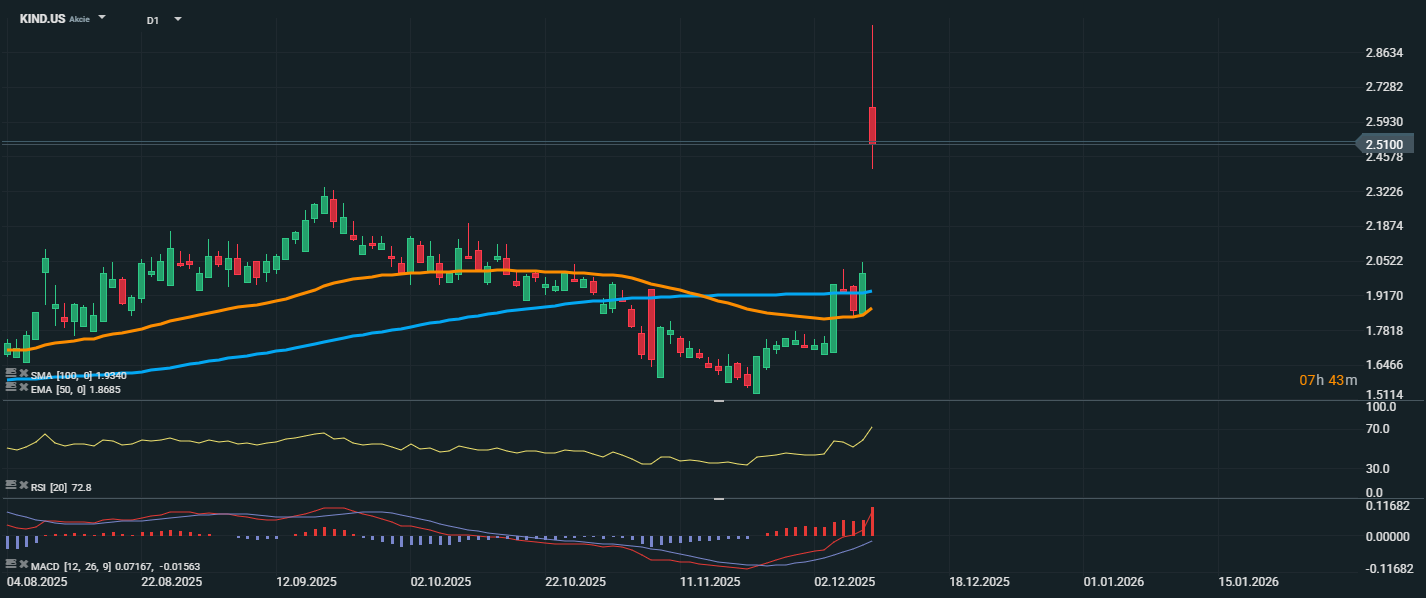 Akcie Nextdoor Holdings zaznamenali prudký rast a aktuálne sa obchodujú na úrovni 2,51 USD, čo predstavuje takmer 50 % nárast za jediný deň. Cena prerazila nad dve kľúčové technické úrovne – EMA 50 (1,87 USD) a SMA 100 (1,93 USD) a uzavrela výrazne nad týmito priemermi, čo potvrdzuje zmenu trendu z medvedieho na býčí. RSI sa nachádza na úrovni 72,8, čo naznačuje vstup do prekúpeného pásma a môže signalizovať krátkodobú korekciu.
