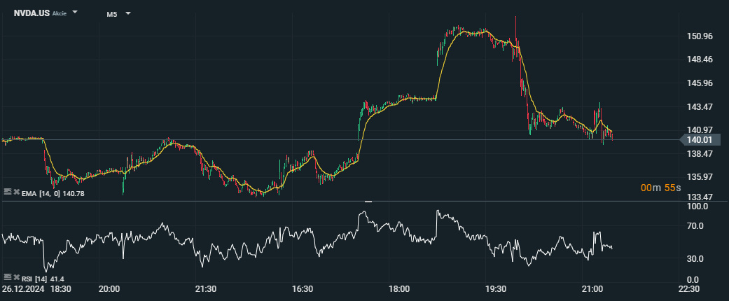 "Akcie Nvidia klesli po dosiahnutí rekordného maxima na CES 2025" Graf znázorňuje intradenný pohyb akcií Nvidia. Po dosiahnutí rekordného maxima 148,88 USD počas obchodovania akcie prudko klesli a uzavreli na 140,01 USD. Pokles nasledoval sklamanie investorov z nedostatku noviniek o budúcej generácii AI čipov počas prezentácie Jensena Huanga na CES. RSI (Index relatívnej sily) na konci obchodného dňa signalizuje prepredané úrovne. Zdroj: xStation5