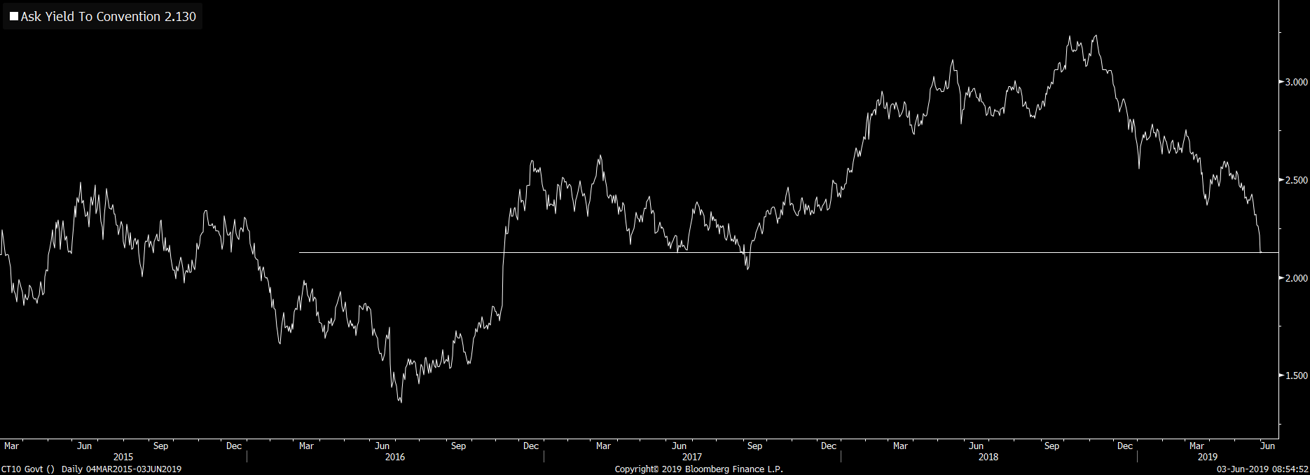 Výnos z amerických desetiletých dluhopisů prudce klesá k minimům z roku 2017. Zdroj: Bloomberg
