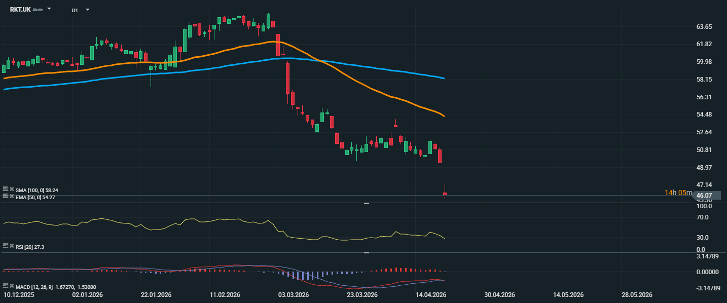 Akcie spoločnosti Reckitt sa nachádzajú vo výrazne negatívnom technickom nastavení. Cena klesla približne na 46,07 GBP a drží sa hlboko pod kĺzavými priemermi EMA 50 na úrovni 54,27 GBP a SMA 100 okolo 58,24 GBP. Tento výrazný odstup potvrdzuje silu súčasného downtrendu a ukazuje, že trh zostáva pod jasnou kontrolou predajcov. V posledných týždňoch je viditeľná séria prudkých výpredajov, po ktorých síce prichádzali krátke stabilizácie, tie však nedokázali zmeniť celkový smer. Naopak, každý pokus o rast zatiaľ pôsobí len ako dočasná korekcia v rámci širšieho poklesu. Negatívny obraz podporuje aj RSI na hodnote 27,3, ktoré už vstúpilo do pásma prepredanosti. To síce môže krátkodobo zvýšiť pravdepodobnosť technického odrazu, samo osebe to však ešte neznamená obrat trendu.